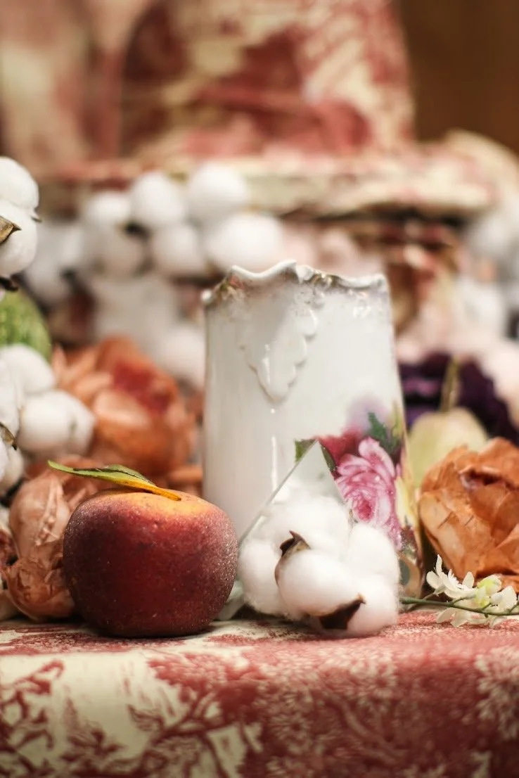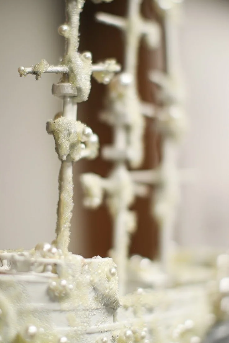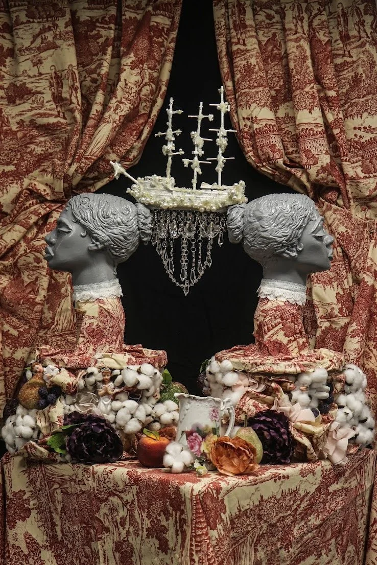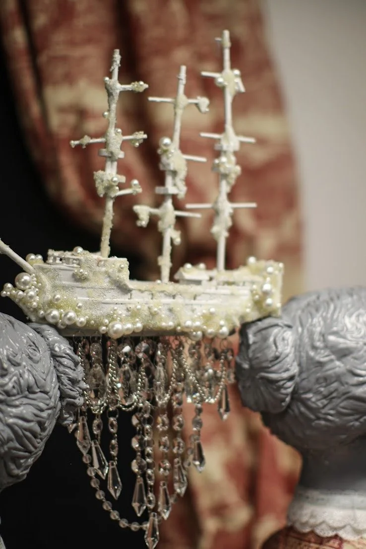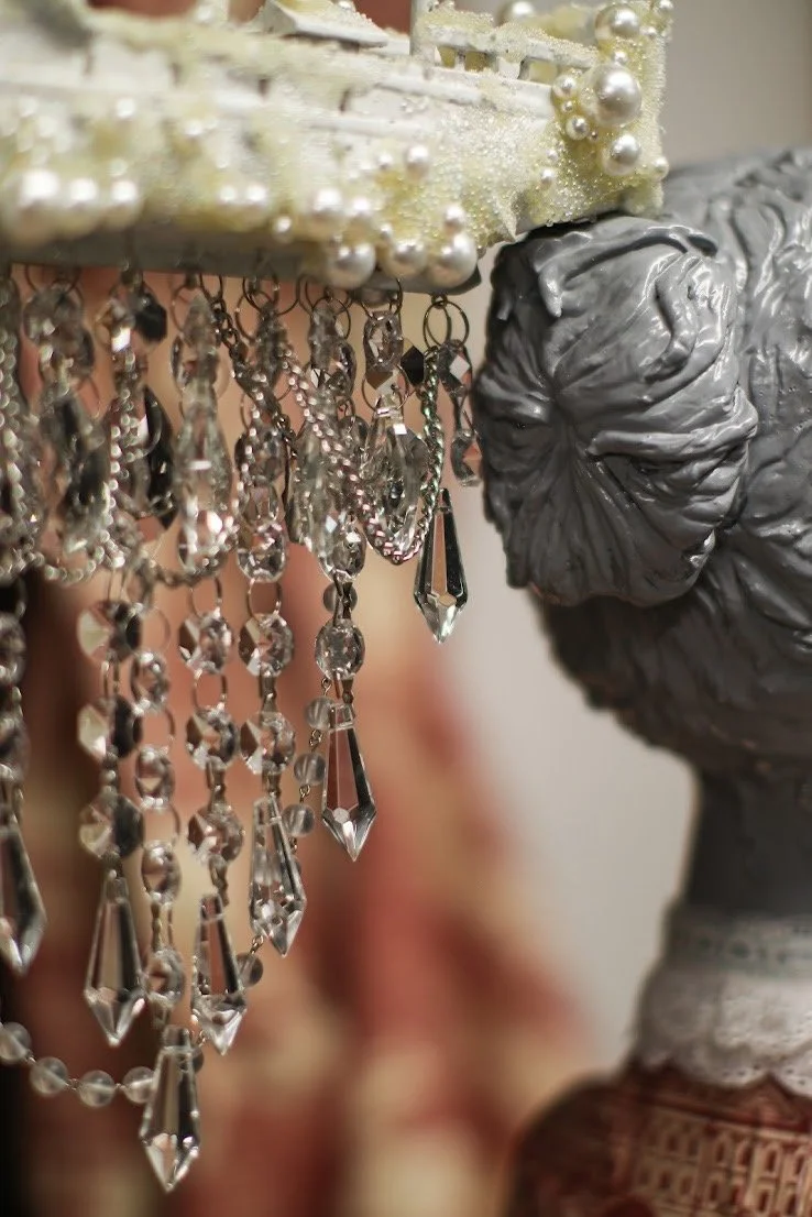 Toile, cotton, beads, chandelier pieces, glass, chain, fabric flowers, lace, clay, porcelain, various recycled ready-made objects.