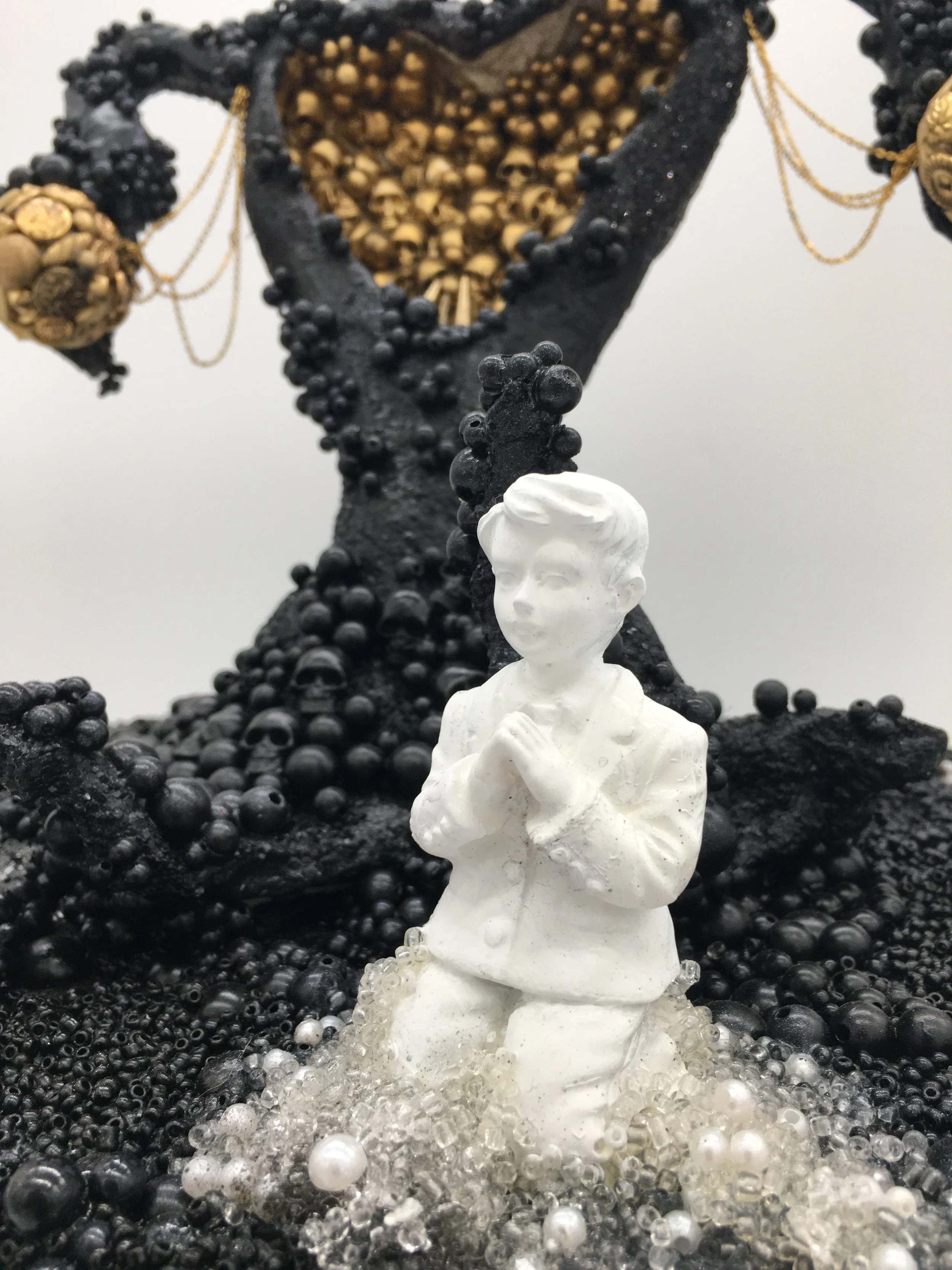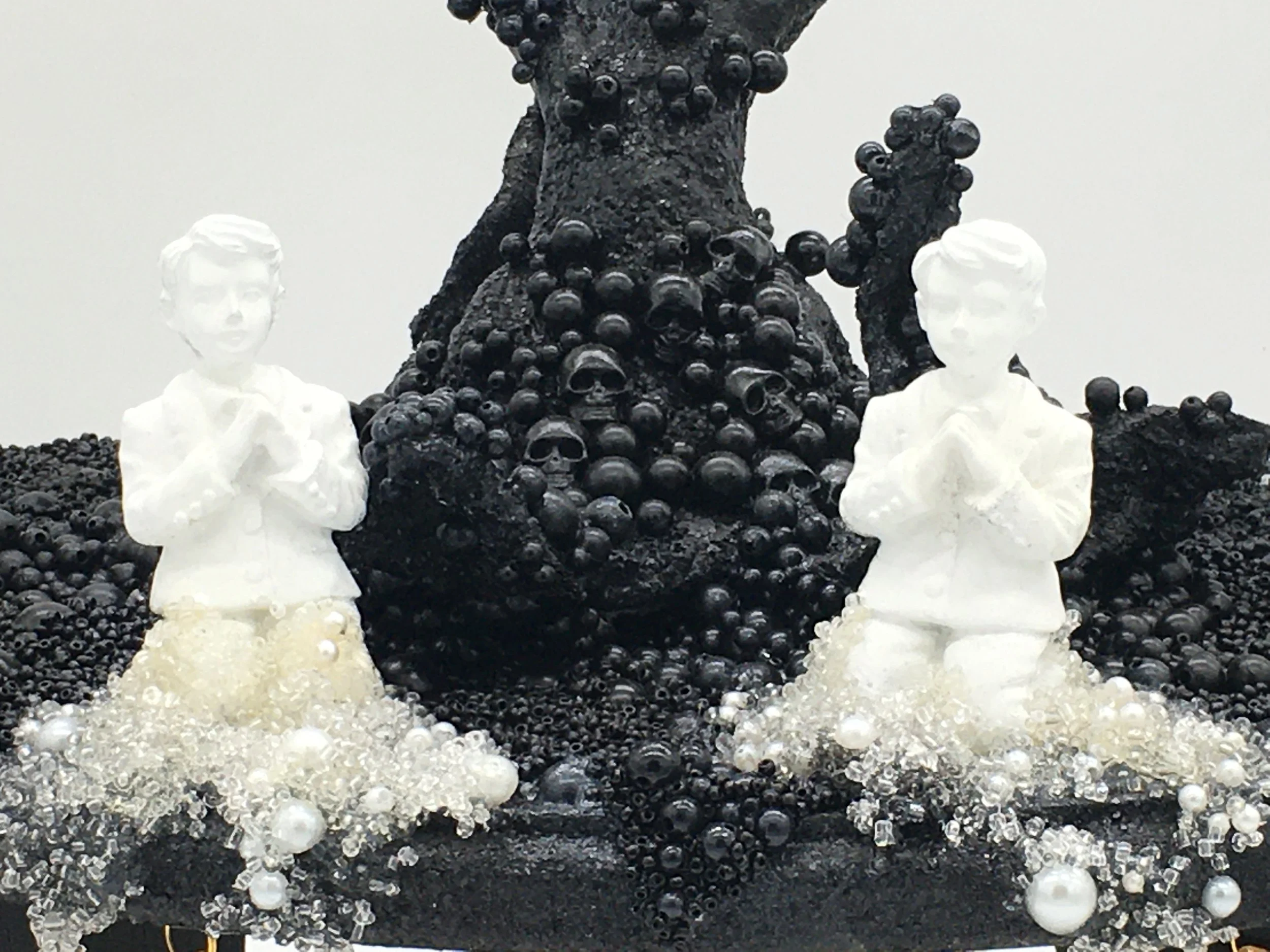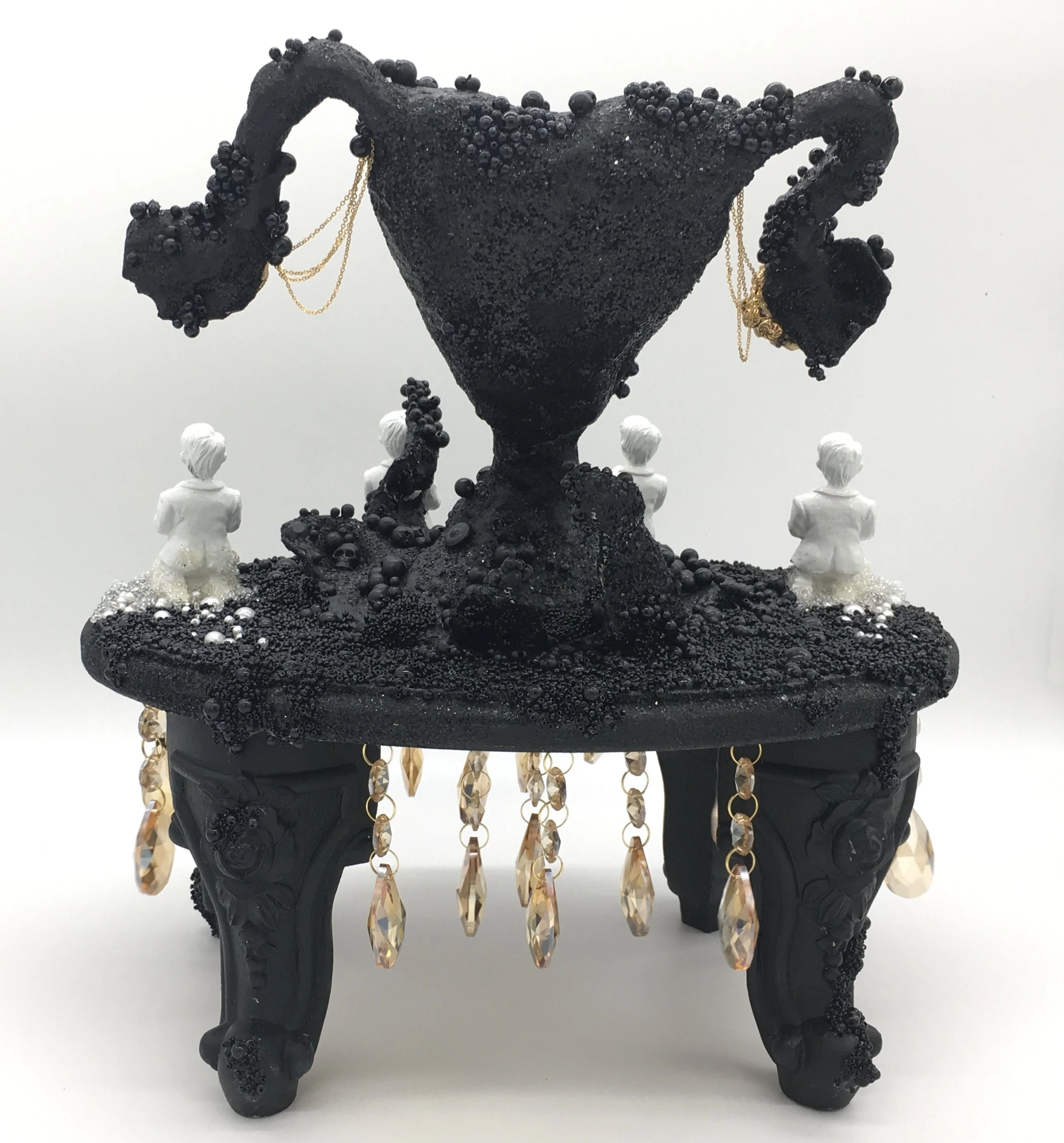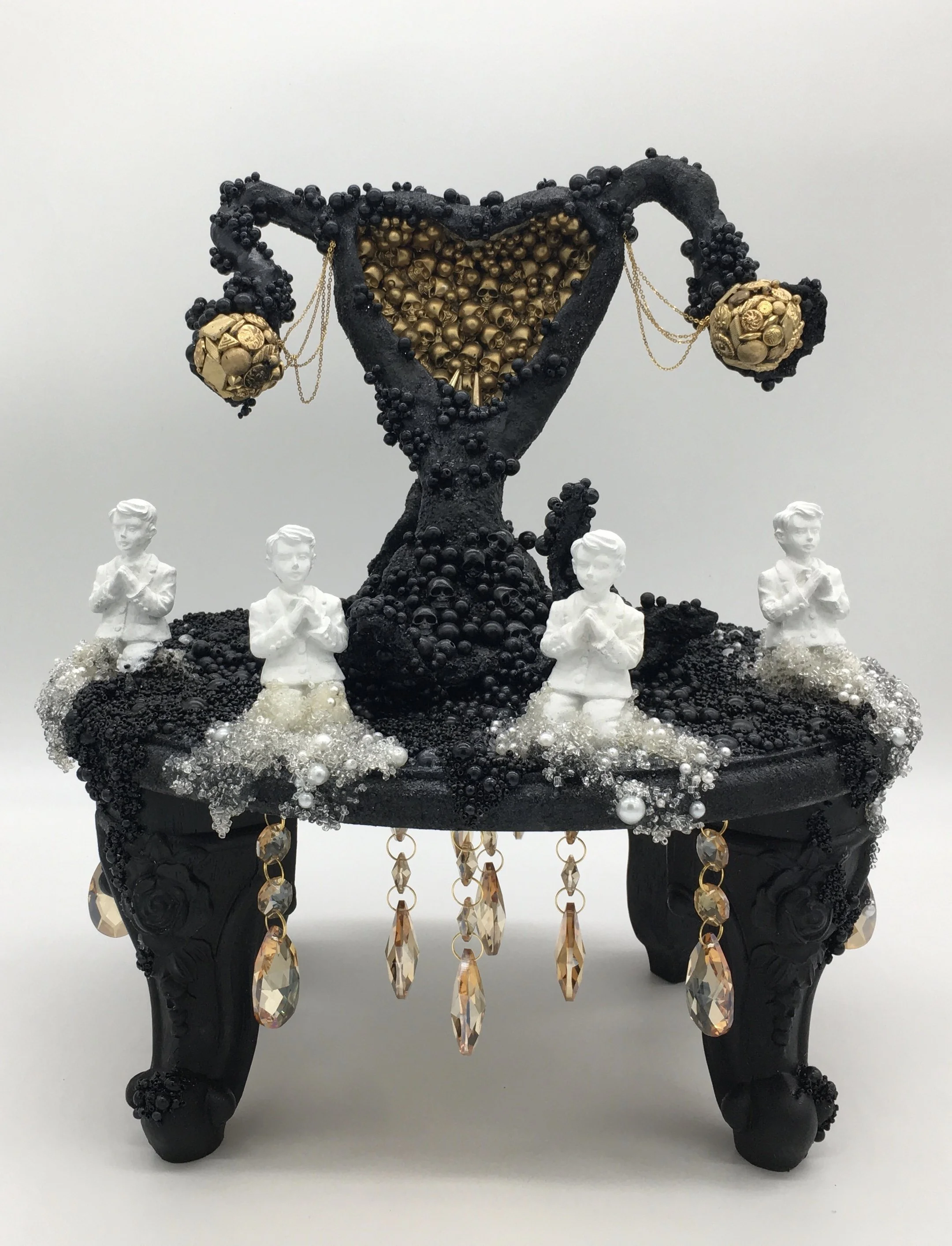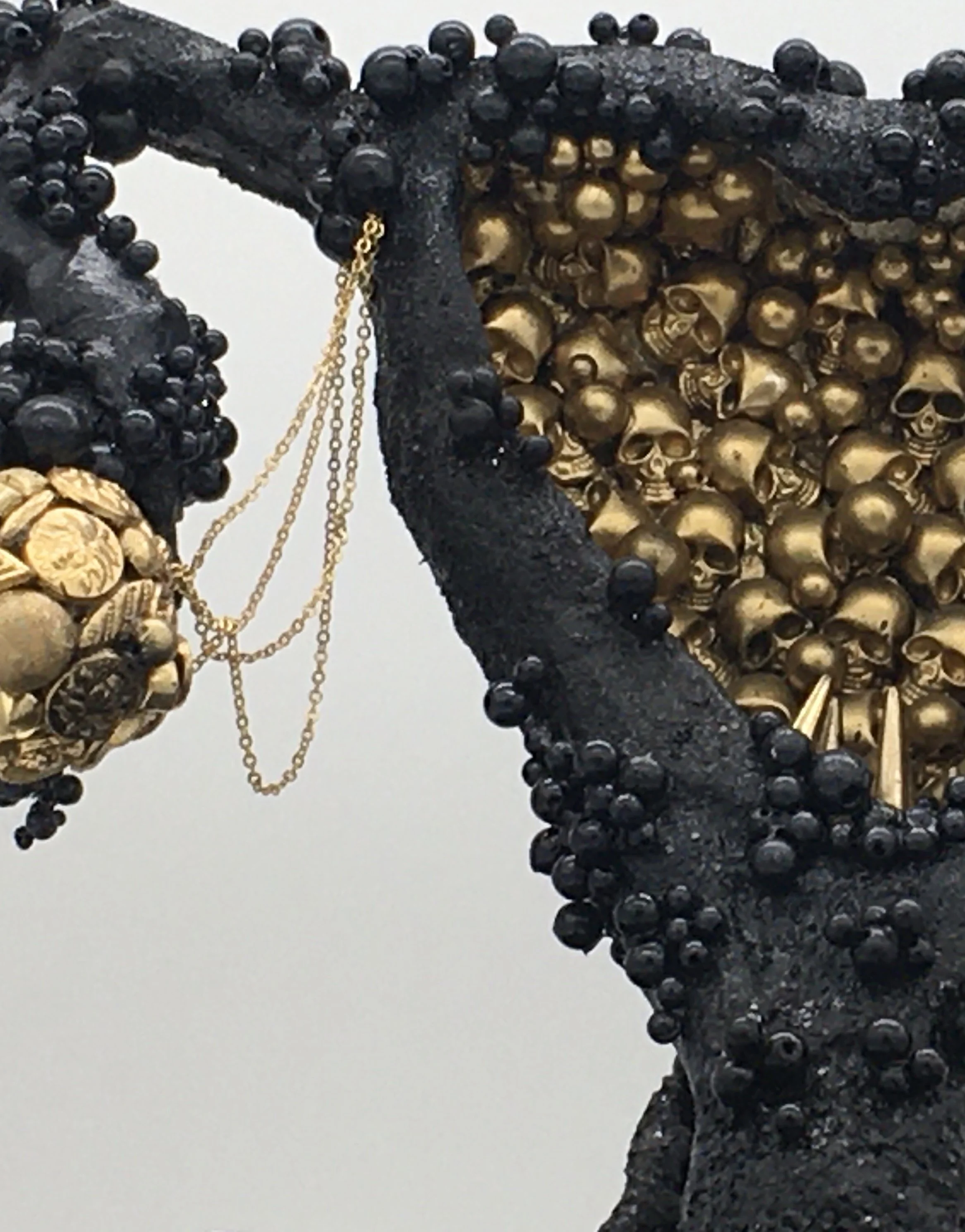 Beads, chandelier pieces, plastic, beads, metal, chain, charms, wood, wire mesh, studs, wood putty, glitter, joint compound, clay, recycled ready-made objects.