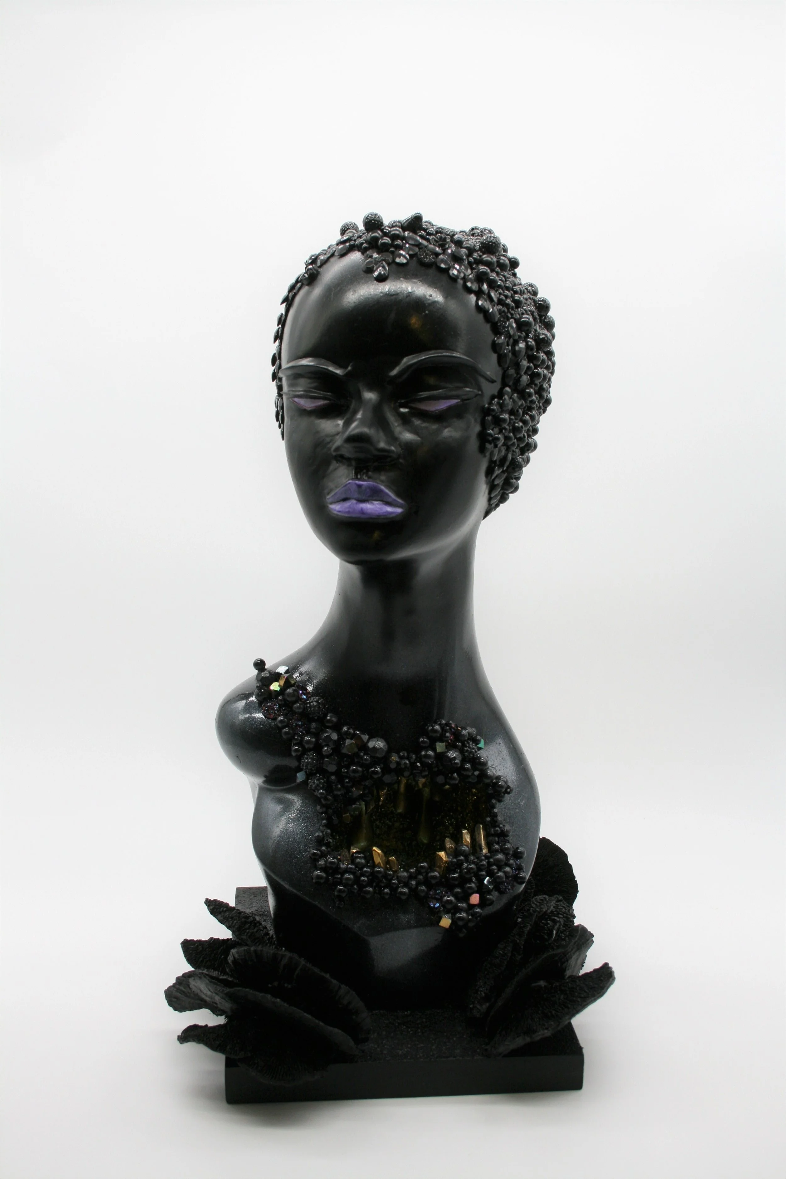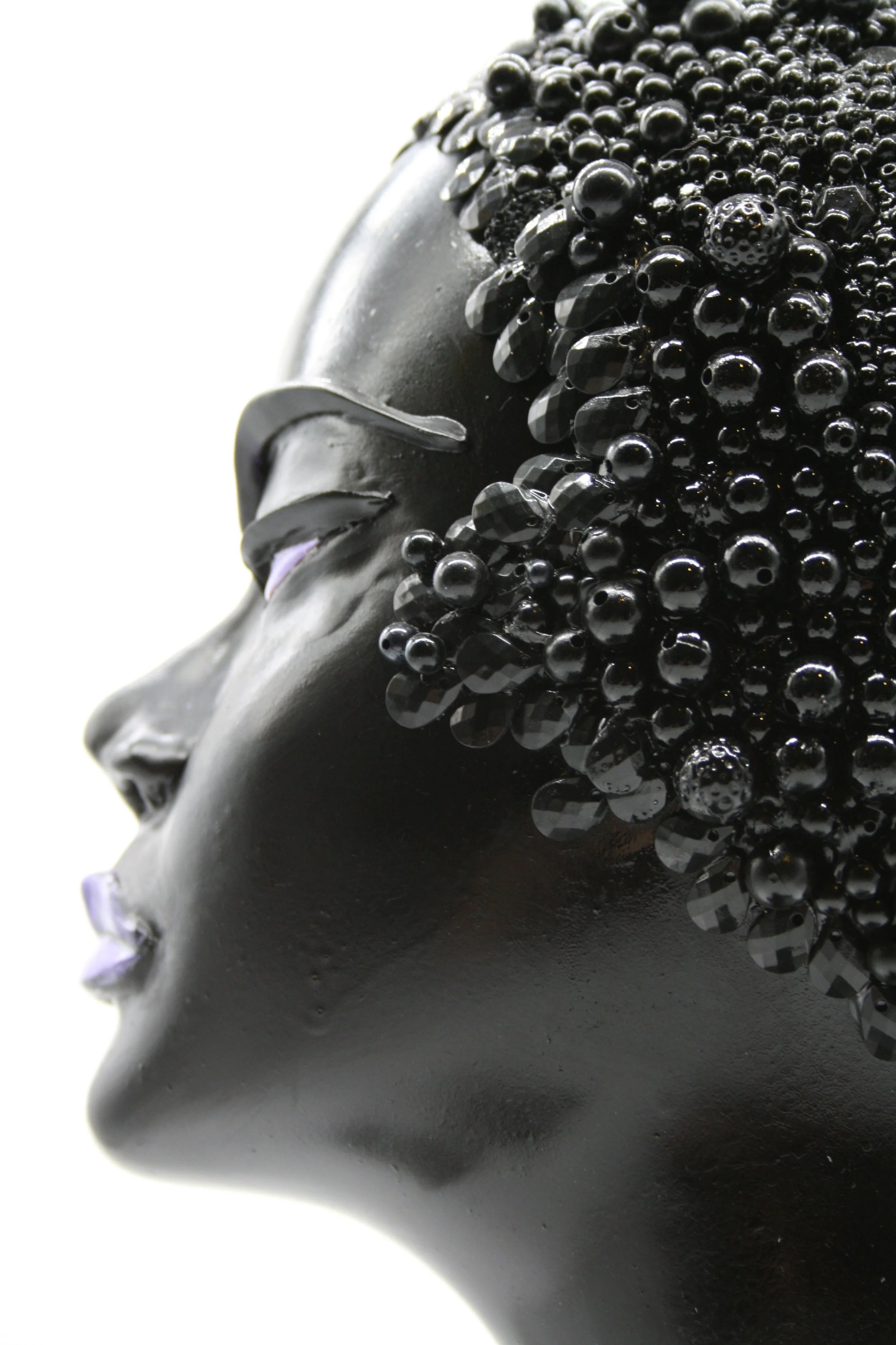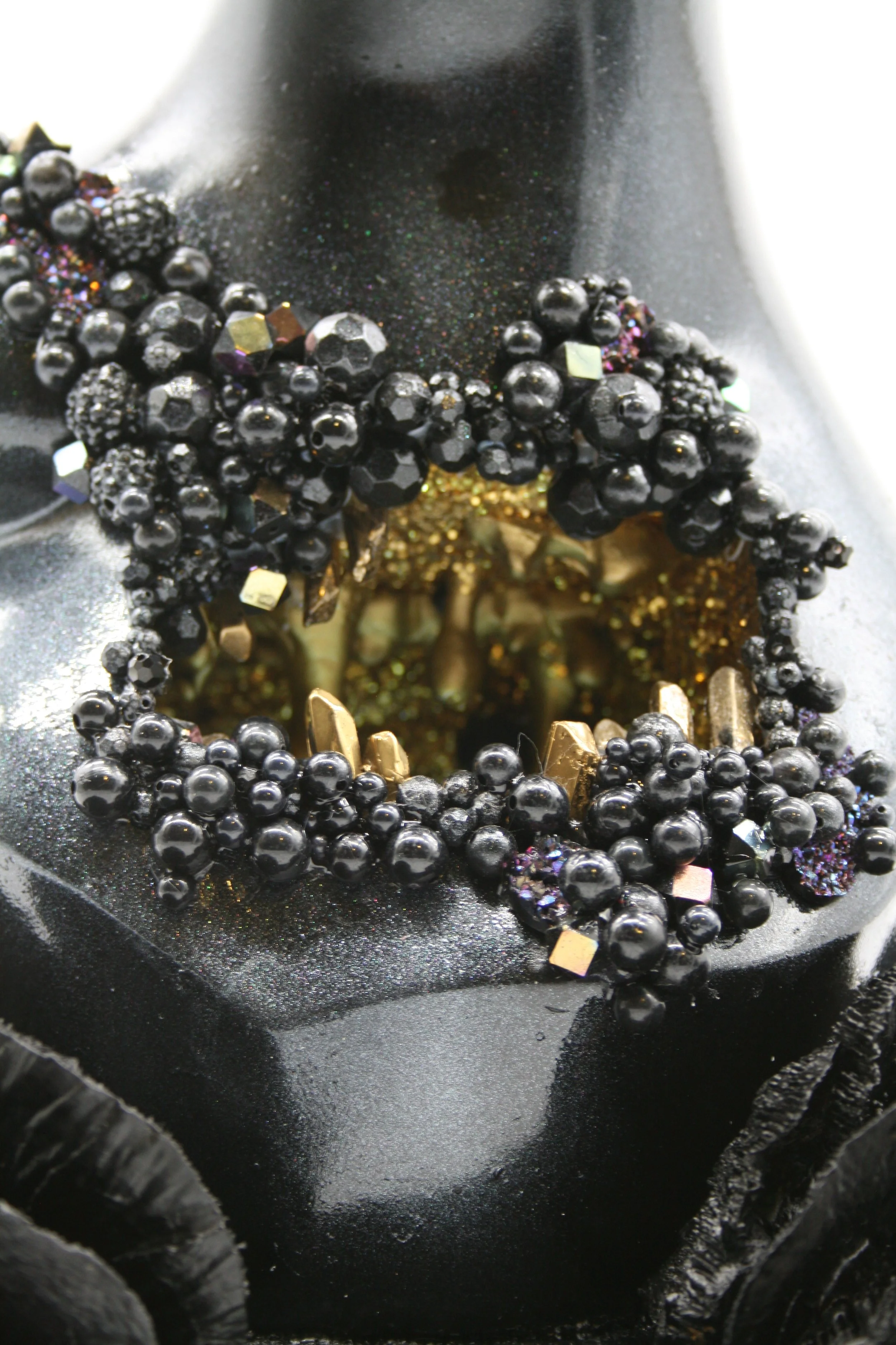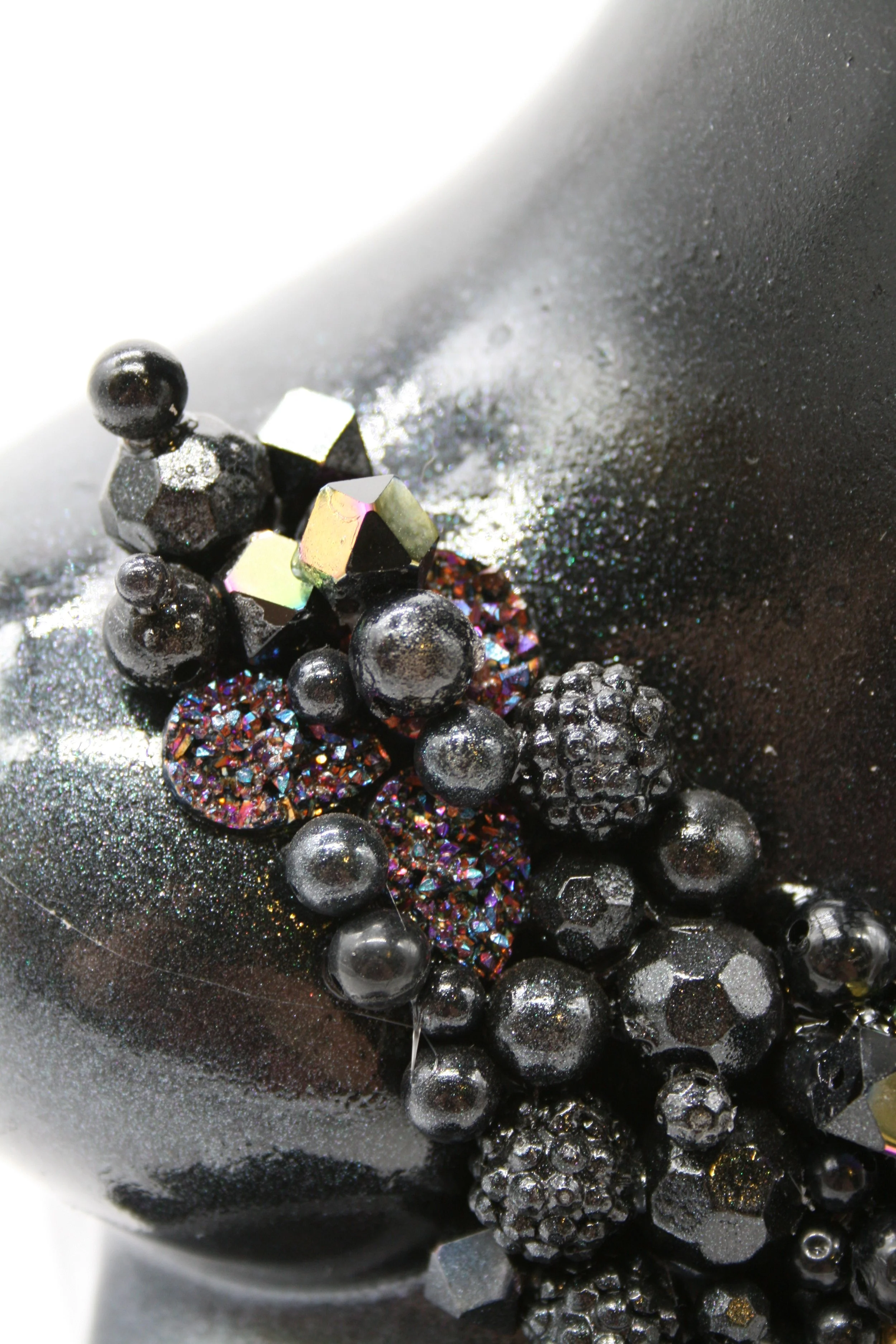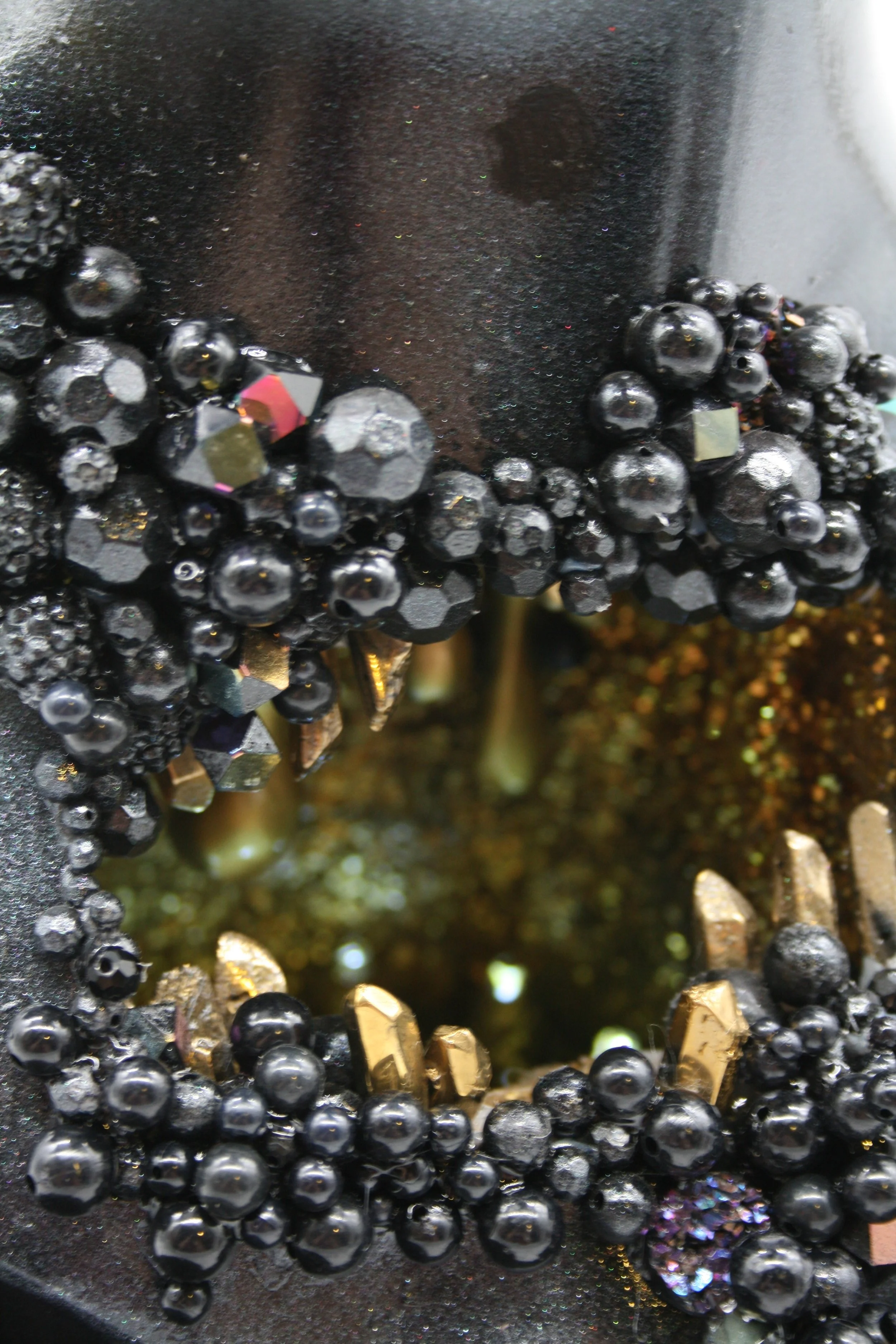 Dried mushrooms, beads, glass, gemstones, clay, spike, studs, plastic, glitter, paint.