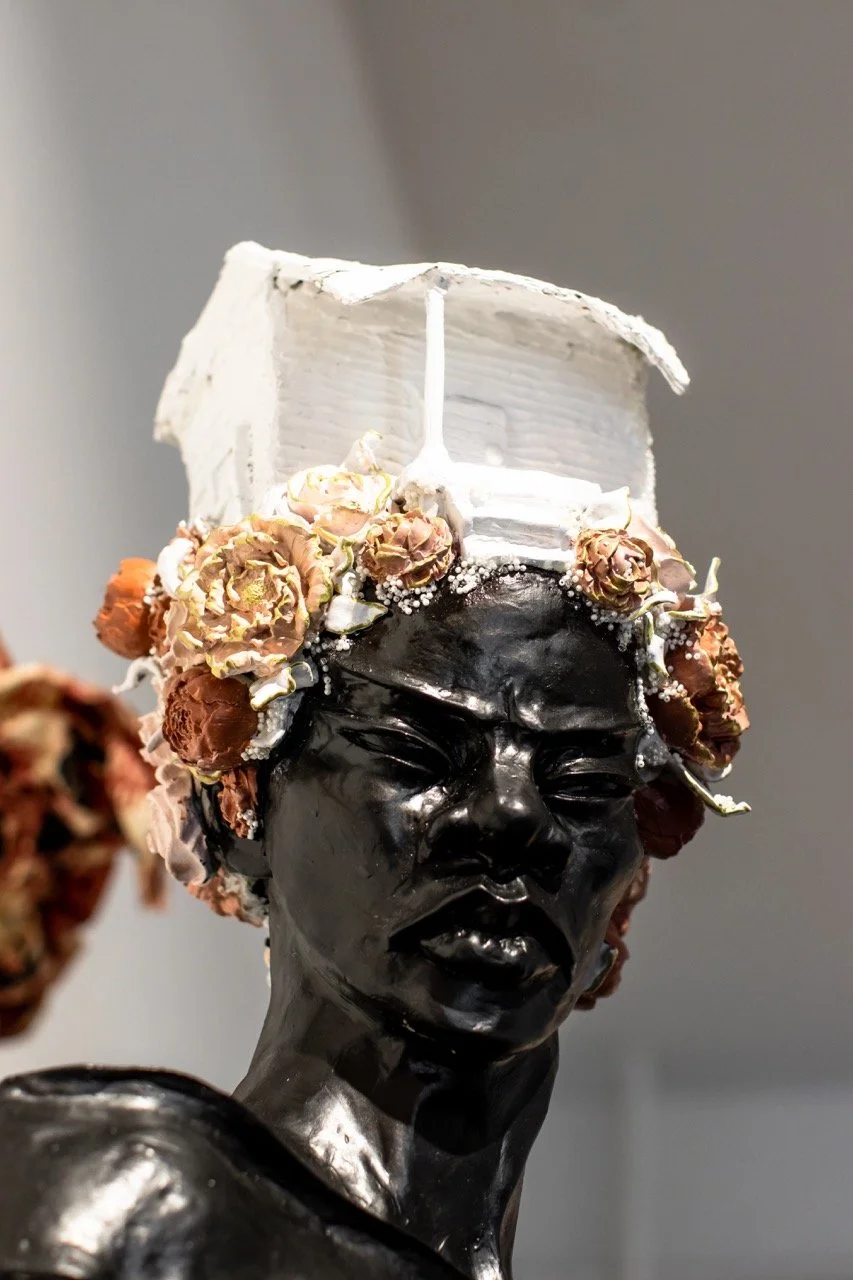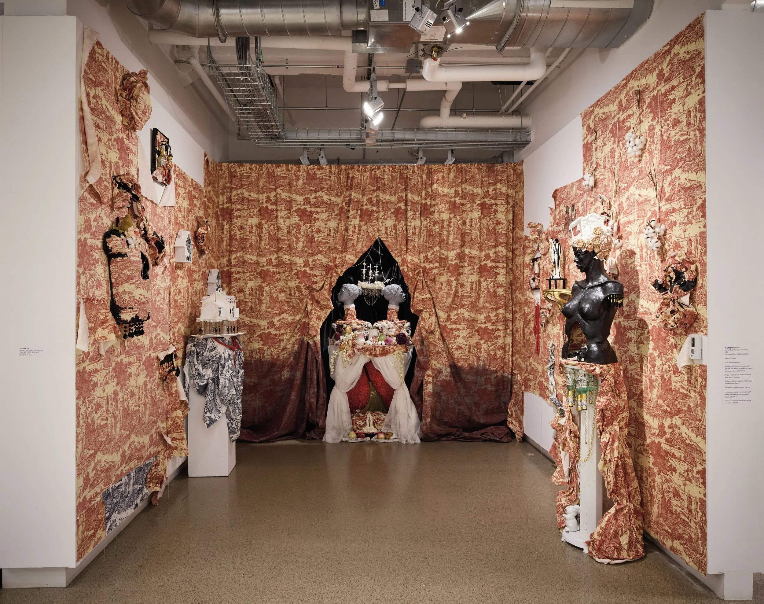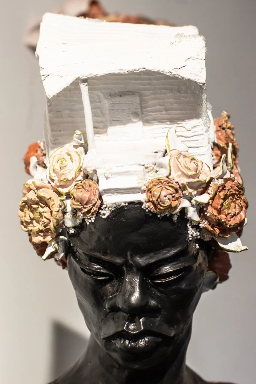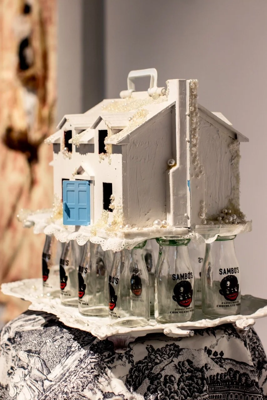 In this project, I employ the metaphor of a house to represent the social systems and constructs in which we live, often complacently without questioning their foundations. Drawing from the real estate term "bad bones," which describes a house's foundation and its ability to withstand the test of time, I extend this term to characterize the societal structures we inherit and perpetuate generationally or those we adopt to contextualize our present lives. Ornamental assemblages throughout the installation create layers of codes and constructs specifically felt within the Black community.