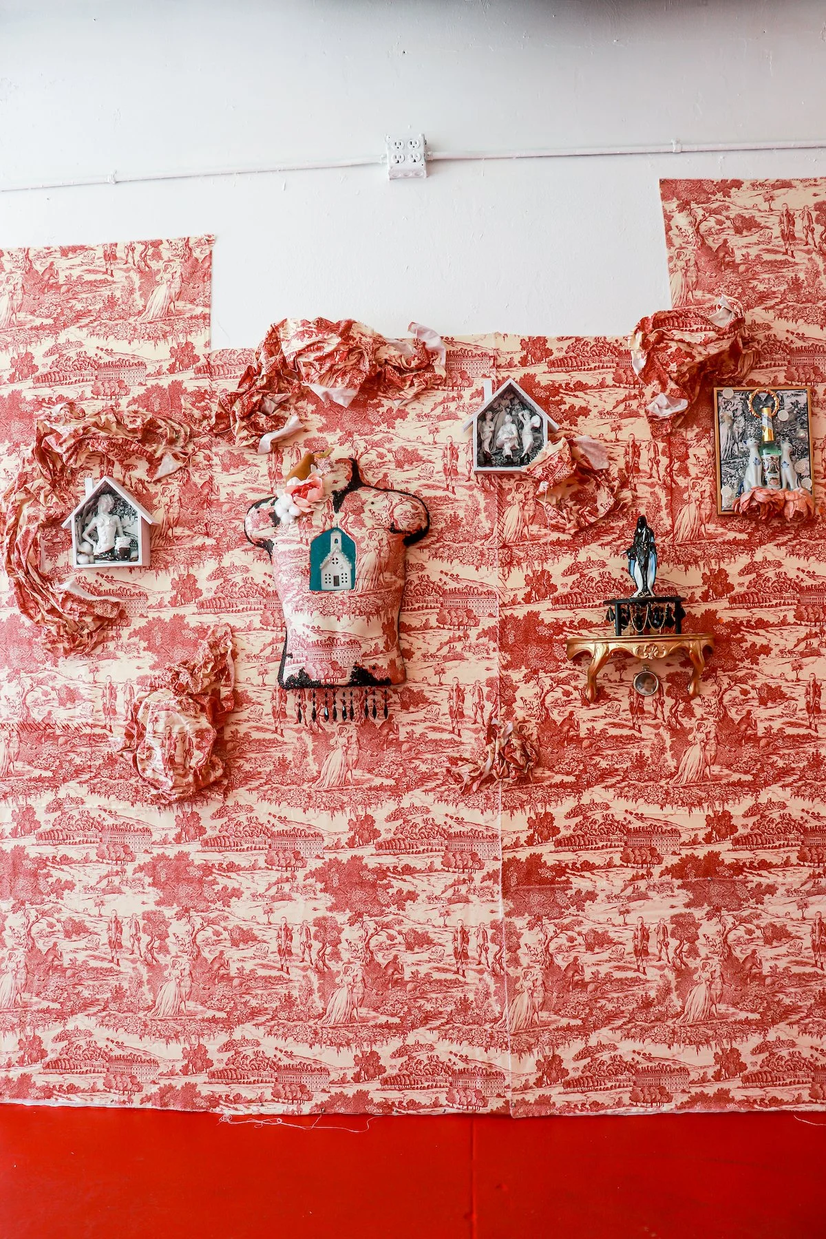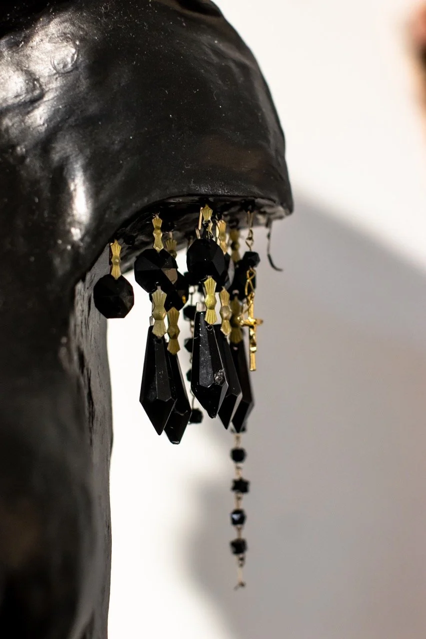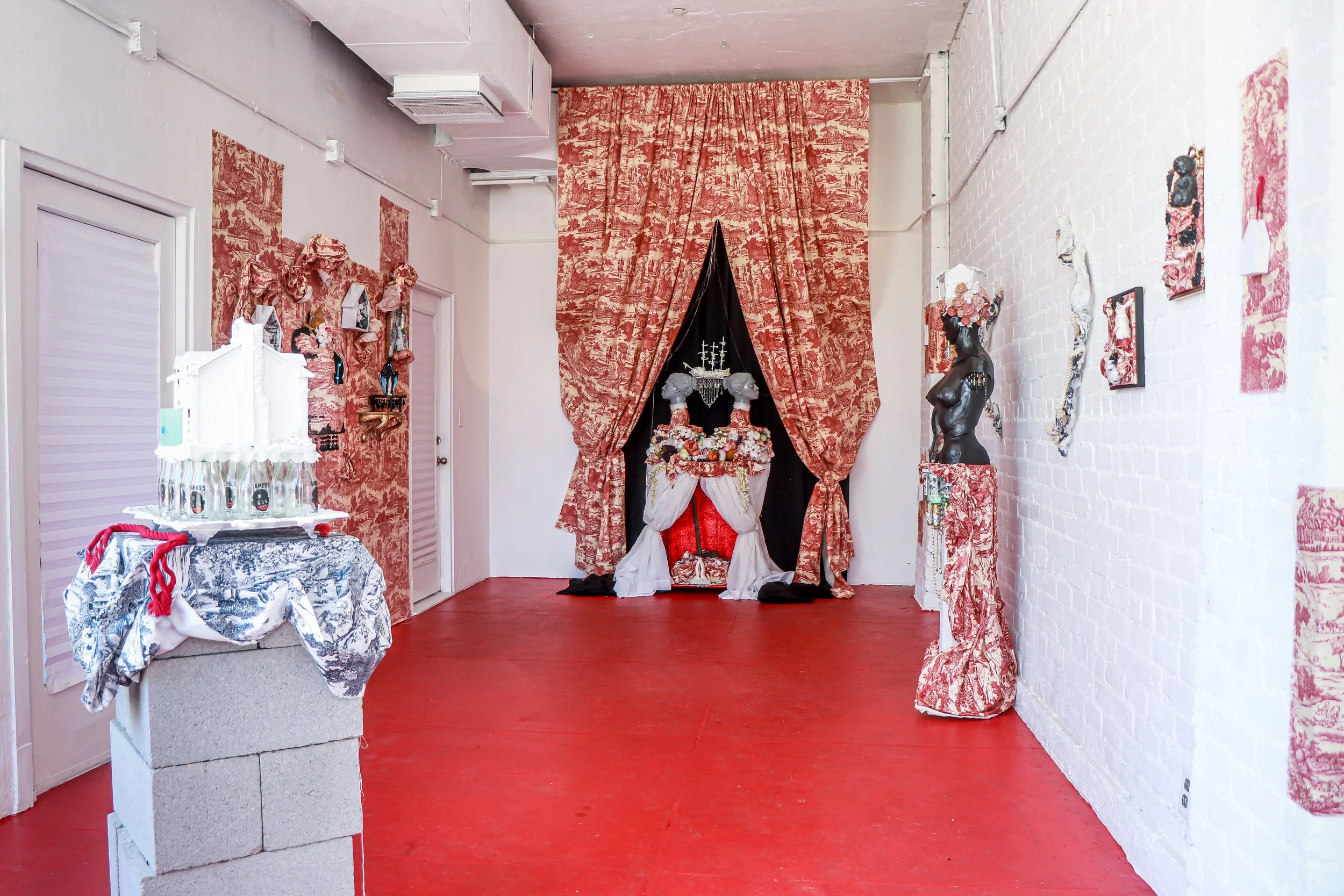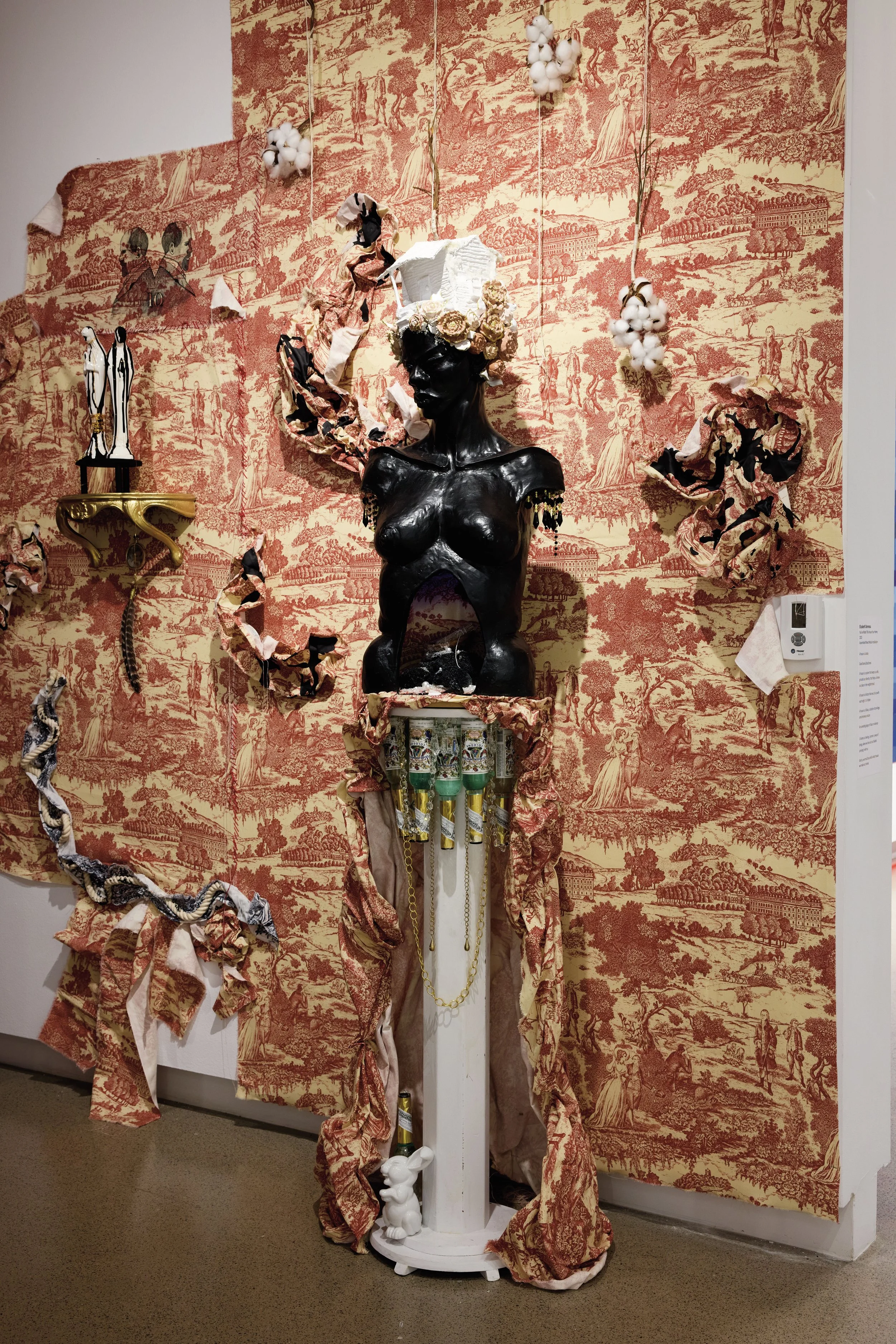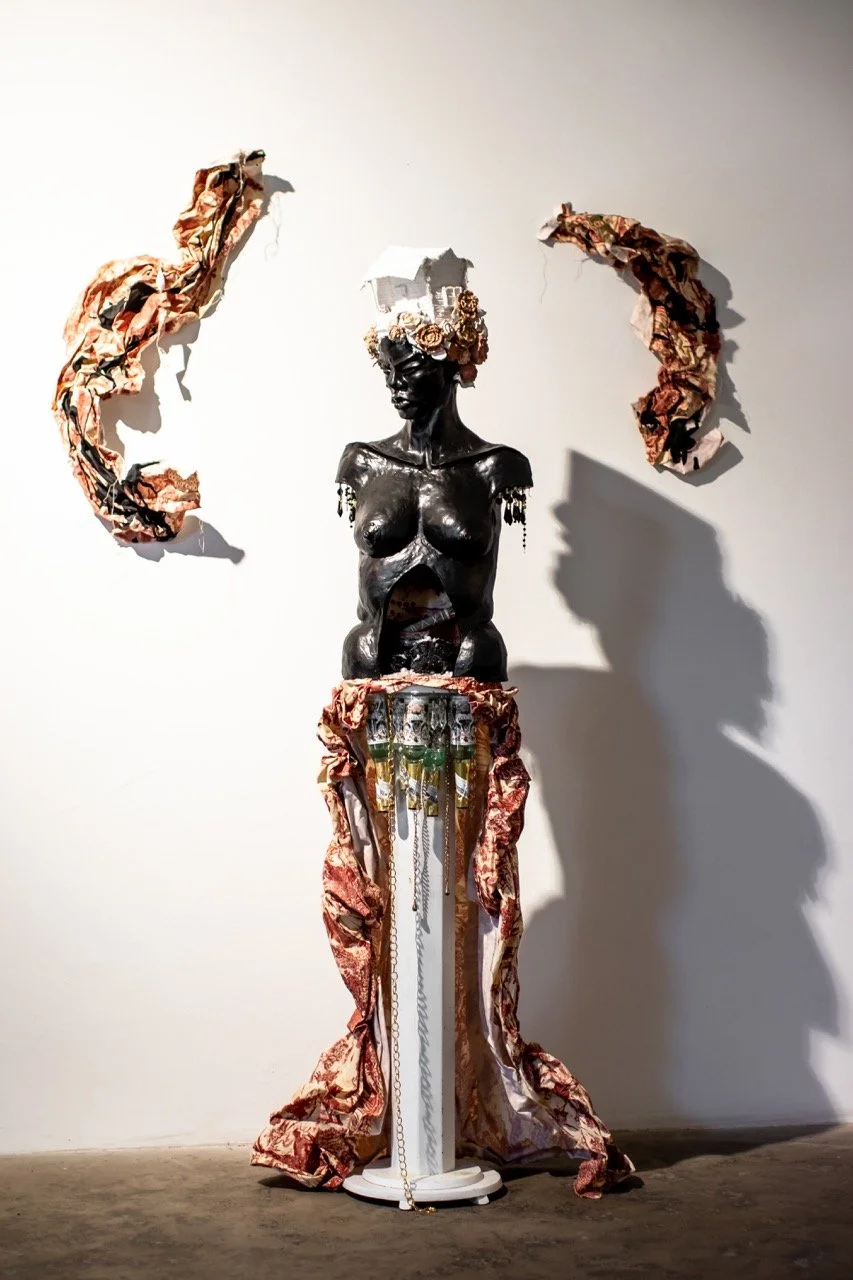 In this project, I employ the metaphor of a house to represent the social systems and constructs in which we live, often complacently without questioning their foundations. Drawing from the real estate term "bad bones," which describes a house's foundation and its ability to withstand the test of time, I extend this term to characterize the societal structures we inherit and perpetuate generationally or those we adopt to contextualize our present lives. Ornamental assemblages throughout the installation create layers of codes and constructs specifically felt within the Black community.
